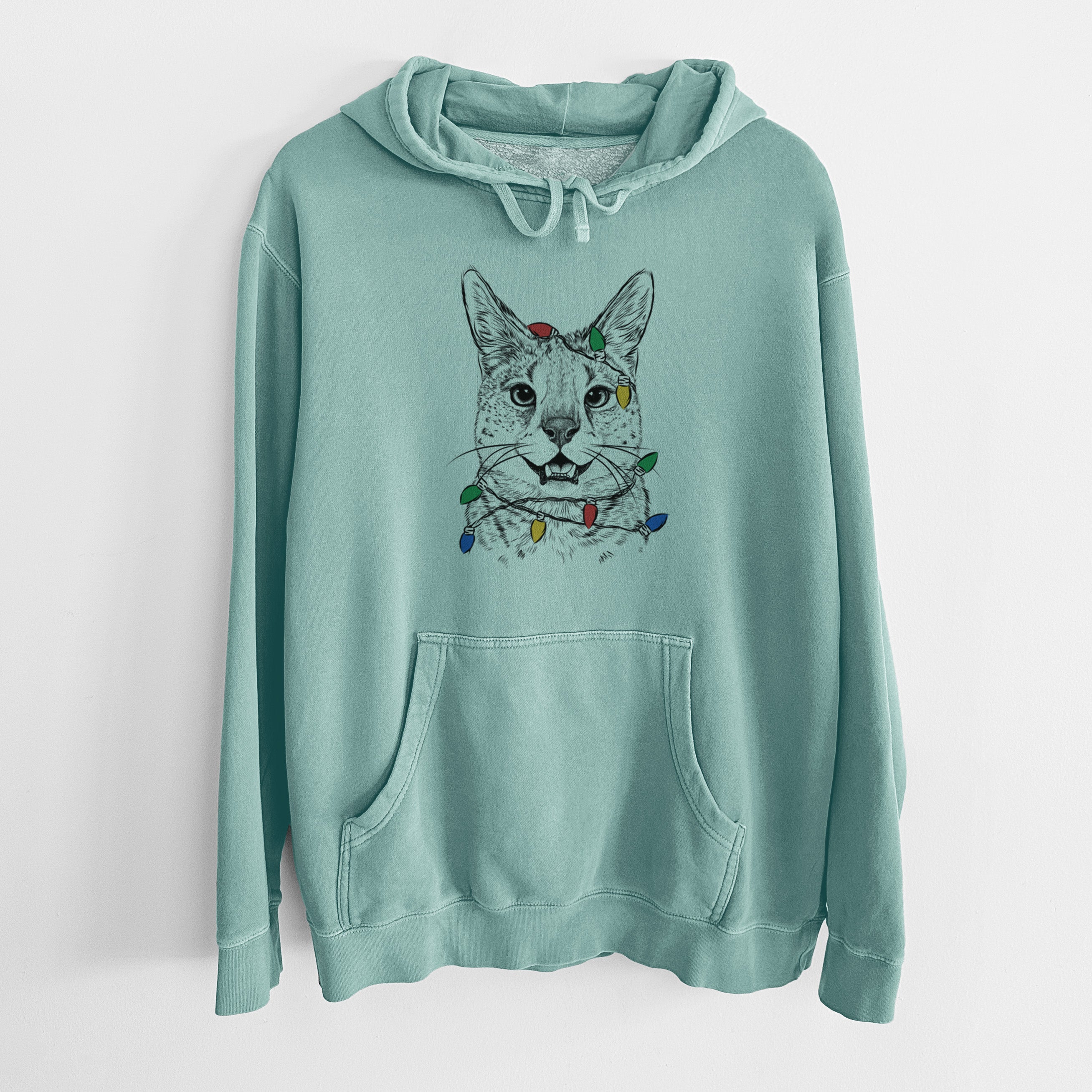 Christmas Lights Lucky the Serval Cat - Unisex Pigment Dyed Hoodie